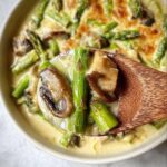 This Asparagus and Mushroom Au Gratin is a creamy, cheesy vegetable casserole perfect as a comforting side dish. Tender asparagus and sautéed mushrooms are combined with a rich milk and sherry béchamel sauce, topped with melted mozzarella cheese, then baked until bubbly and golden. It’s a delightful way to enjoy fresh spring vegetables with a luscious, savory twist.