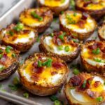- Add Cheese and Bacon: Remove the baking sheet from the oven and sprinkle shredded cheddar cheese and crumbled bacon evenly over each potato round. Return the sheet to the oven for an additional 5–7 minutes, or until the cheese is melted and bubbly.