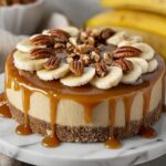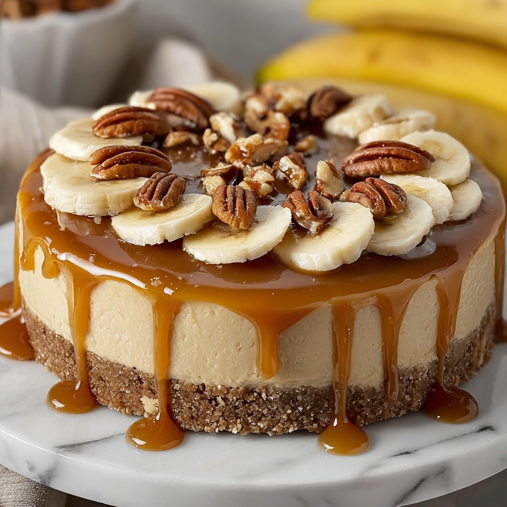 - Add toppings and serve: Once chilled, top the cheesecake with the sliced ripe bananas. Drizzle generously with caramel sauce and sprinkle the chopped walnuts or pecans evenly over the top before slicing and serving.