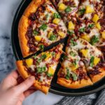 This BBQ Chicken Pizza is a delicious and quick meal featuring a crispy crust topped with tangy BBQ sauce, rotisserie chicken, fresh pineapple, melted Monterey Jack and mozzarella cheeses, and optional toppings like bacon, jalapeños, and cilantro. Perfect for a family dinner or casual gathering, it combines savory and sweet flavors with a hint of spice.