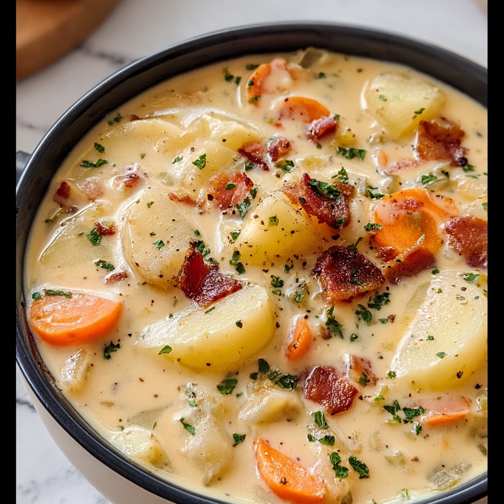 Gathering simple, fresh ingredients is the key to making a soup that tastes like it came straight from your grandma’s kitchen. Each component adds its own magic — from the earthy potatoes and crisp carrots to the savory bacon and creamy dairy — creating a harmony of flavors and textures you’ll adore.