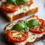 Caprese Toast is a quick, fresh, and flavorful open-faced sandwich that combines toasted ciabatta or sourdough bread with creamy fresh mozzarella, ripe tomatoes, fragrant basil, and savory pesto, finished with a drizzle of olive oil and seasoning. Perfect for a light lunch or appetizer in just 15 minutes.