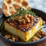 - Garnish and Serve: Sprinkle the toasted walnuts, fresh herbs if using, and cracked black pepper over the caramelized feta. Serve immediately with warm pita, flatbread, or crusty bread for dipping.