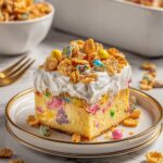 This Cereal Milk Poke Cake is a fun and nostalgic dessert that combines a moist yellow cake infused with sweetened cereal-flavored milk, topped with whipped cream and crunchy cereal for texture. The cake is baked, then poked with holes to soak up a sweet mixture of cereal-infused milk and condensed milk, creating a unique, flavorful treat perfect for breakfast lovers and dessert enthusiasts alike.