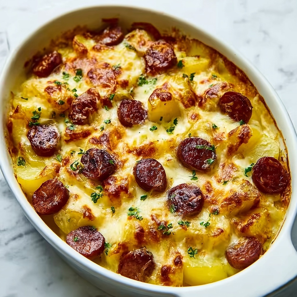 Pour the luscious cheese sauce evenly over the potatoes and smoked sausage in your baking dish. Sprinkle the remaining sharp cheddar cheese on top for that irresistible golden, bubbly finish. Bake uncovered in your preheated oven for 25 to 30 minutes, until the cheese is bubbly with golden edges. If your potatoes need a little extra tenderness, cover with foil and bake an additional 10 minutes to steam them thoroughly.
