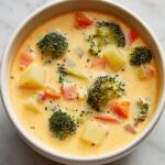 A comforting and creamy cheesy vegetable soup packed with wholesome vegetables like broccoli, cauliflower, carrots, and potatoes, all simmered in a savory chicken broth and enriched with cheddar cheese and half and half for a rich, satisfying meal.