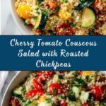 A vibrant and fresh Cherry Tomato Couscous Salad featuring a combination of roasted and fresh cherry tomatoes, Israeli couscous, roasted chickpeas, cucumber, and crumbled feta cheese, all brought together with a zesty lemon-thyme dressing. Perfect as a light lunch or a colorful side dish, this salad balances savory, tangy, and herby flavors with satisfying textures.