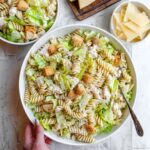 Pour your prepared Caesar dressing over the pasta, Romaine, and chicken. Toss gently but thoroughly to ensure every piece is generously coated with creamy, tangy goodness. If you love crunchy contrasts, now’s the time to stir in some croutons. Finish by sprinkling extra Parmesan cheese on top for that irresistible finishing touch. Serve immediately or chill it until you’re ready to serve.