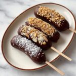 Once your bananas are frozen solid and the chocolate is melted, it’s time for the fun part: dipping. Take each frozen banana pop and dunk or drizzle the chocolate over it, letting any excess drip back into the bowl. While the chocolate is still wet, sprinkle on your choice of toppings like chopped peanuts, shredded coconut, granola, cacao nibs, or a pinch of flaky salt. This adds not only flavor contrast but also a playful texture that makes every bite exciting.