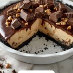 - Add ganache and chill: Pour the cooled ganache over the peanut butter filling, spreading it evenly. Refrigerate the pie for at least 4 hours or until fully set.