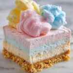 - Finish and Decorate: Remove the cheesecake from the freezer when ready to serve. Remove the springform pan and parchment paper. Generously top the cheesecake with fluffy cotton candy just before serving to add a whimsical and playful finish.