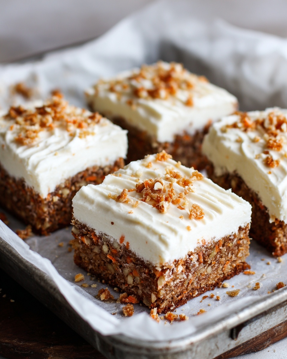 - Frost and Serve: Spread the cream cheese frosting evenly over the cooled carrot cake bars. Garnish with additional chopped walnuts if desired. Cut into bars and serve at room temperature.