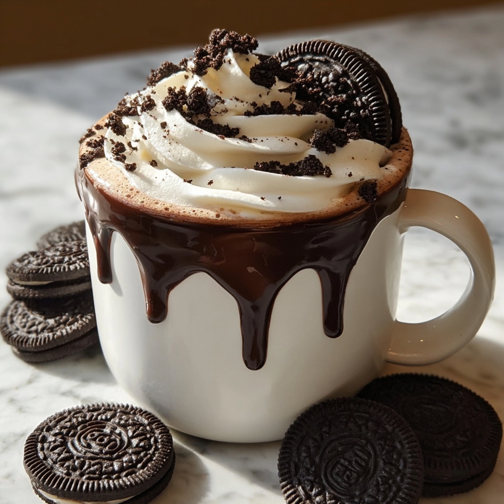 - Add Toppings and Garnish: Top each mug with whipped cream, drizzle chocolate syrup over the whipped cream, and garnish with a whole Oreo cookie for a fun and indulgent finish.