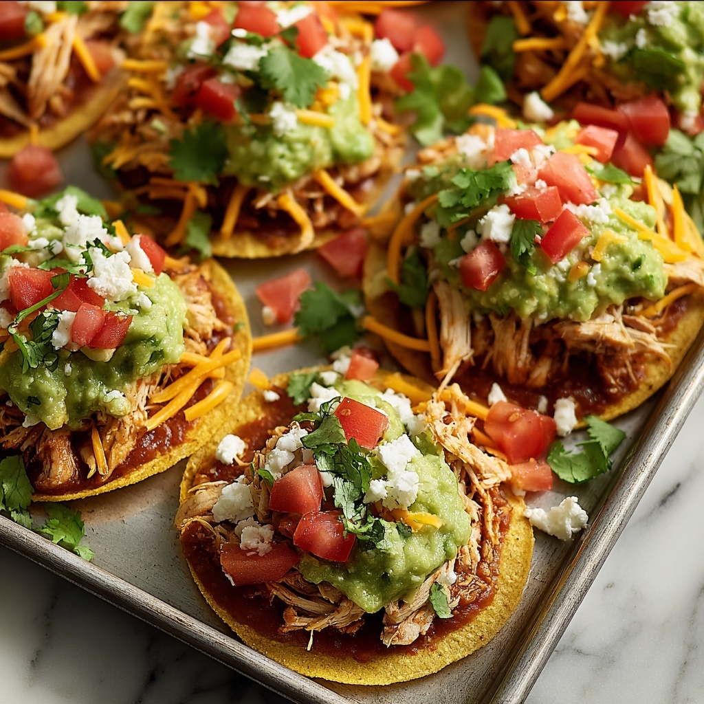 It’s time for the best part—topping your tostadas! Sprinkle shredded lettuce, cheese, diced tomatoes, and chopped cilantro over the chicken layer. The shredded cheese will naturally soften and meld with the warm chicken and beans underneath. Finally, add dollops of sour cream and optional guacamole for creamy, cooling elements that contrast the spices and crunchy shells delightfully.