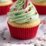 The garnish options for these cupcakes turn each bite into a little celebration. Mini candy canes add a minty crunch that complements the sweet frosting, while edible snowflakes sprinkle a bit of wintry whimsy. Red and green sprinkles bring vibrant color and texture, making each cupcake look as festive as it tastes.