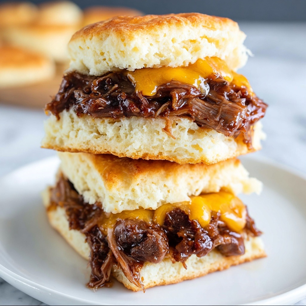 - Assemble Biscuits: Once baked, carefully cut each biscuit in half with a paring knife. Layer the warm shredded beef on the bottom half, then top with slices of provolone cheese.