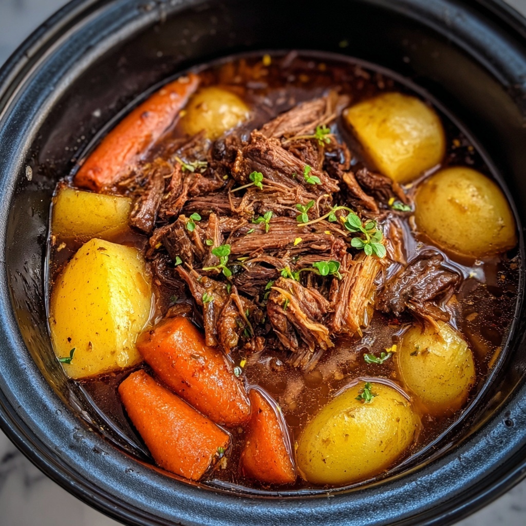 Serve the shredded beef and veggies over creamy mashed potatoes or buttered egg noodles to soak up all the savory sauce. For a rustic look, use individual clay pots or ramekins to serve personal portions, garnished with a sprig of fresh rosemary.
