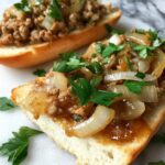 The magic begins with the garlic bread base. Preheat your oven to 400°F (200°C). Mix the softened butter with minced garlic, parsley, and Parmesan cheese in a small bowl. Spreading this savory, cheesy butter mixture over the cut sides of your sandwich rolls guarantees a crust that’s golden, crispy, and packed with flavor once baked. Place the rolls buttered side up on a baking sheet and pop them into the oven for about 5 to 7 minutes until they reach that perfect toasty crunch. This step sets the stage beautifully for the sloppy joe filling.