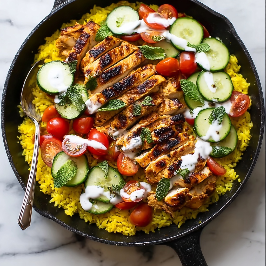 - Final Assembly and Serve: Once the casserole is out of the oven, you can optionally slice the chicken into strips and mix it gently back into the casserole for a shawarma-style presentation. Top the casserole generously with the cucumber and tomato mixture. Serve warm accompanied by your choice of white sauce and hot sauce for added flavor and creaminess, if desired.