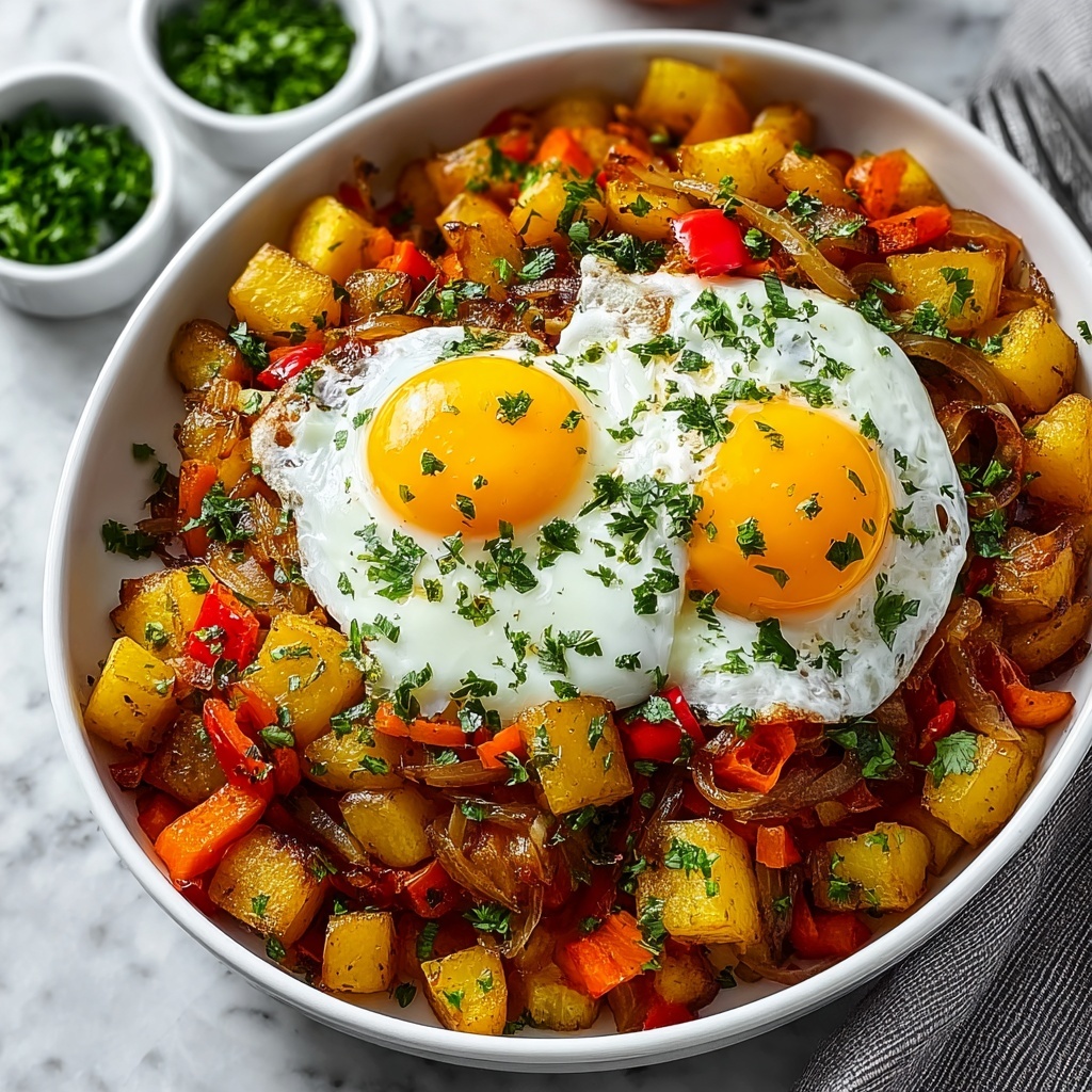 A hearty and flavorful loaded breakfast hash featuring crispy russet potatoes, colorful bell peppers, savory breakfast sausage, and perfectly fried eggs, garnished with fresh parsley. Perfect for a satisfying morning meal.