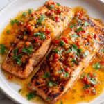 For a dinner party, plate the salmon atop a bed of pasta tossed lightly in olive oil and herbs, then drizzle with extra sauce and garnish with basil. Alternatively, serve each filet on a small stack of polenta rounds or alongside quinoa for a more textured, wholesome spin.