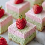 These Matcha Strawberry Cream Bars are a delightful no-bake dessert featuring a crunchy graham cracker crust, a vibrant matcha-flavored cream cheese layer, and a luscious strawberry cream topping. With a combination of creamy textures and fresh fruity notes, they offer a refreshing treat perfect for any occasion.
