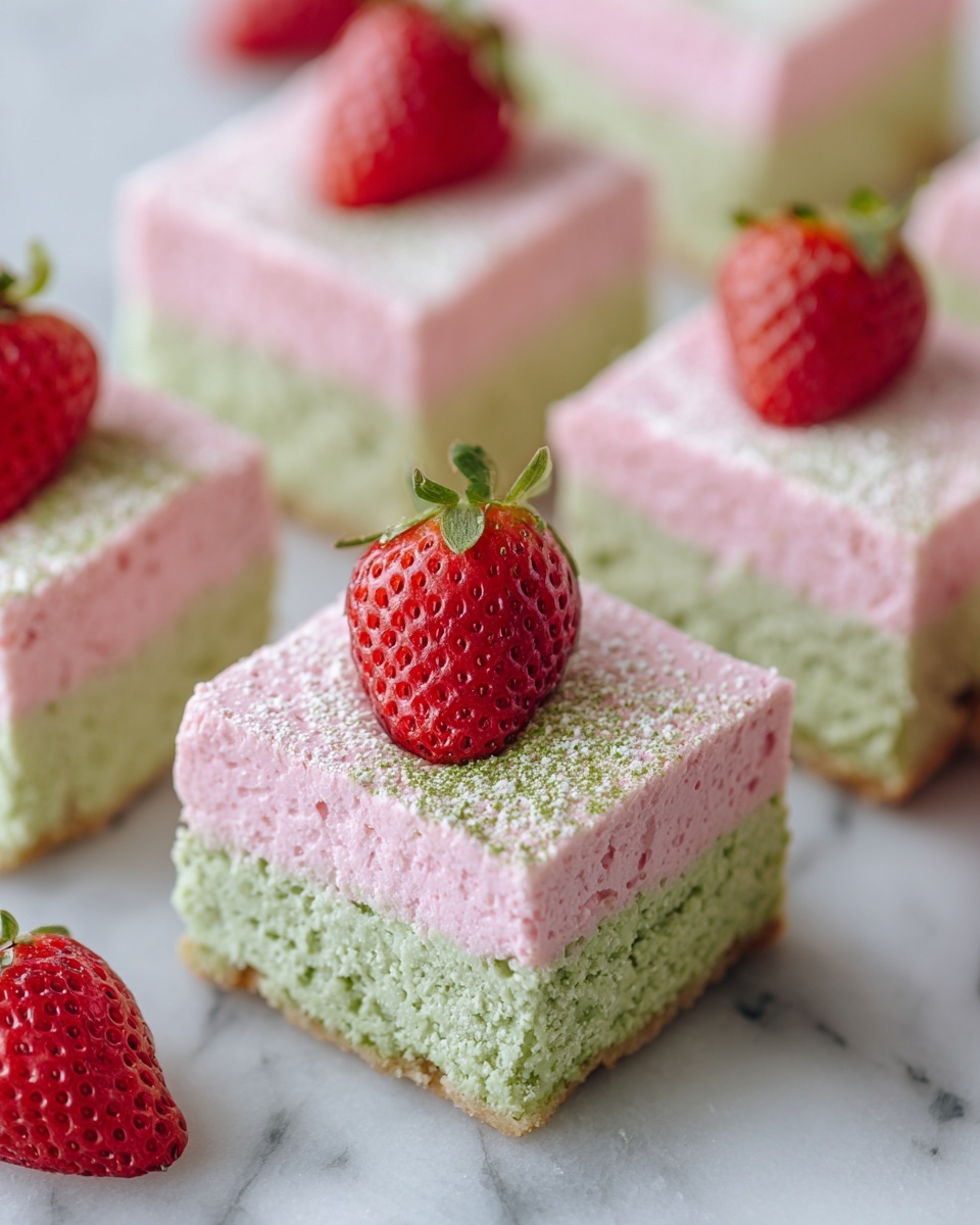 Adding a few garnishes transforms these bars from everyday treats to elegant desserts. Fresh strawberry slices offer a luscious burst of color and flavor that harmonizes with the strawberry cream layer. A light dusting of matcha powder adds a delicate earthiness and visual pop. For extra indulgence, a drizzle of melted white chocolate across the bars makes for a stunning and sweet finishing touch.