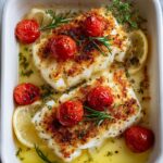 This Mediterranean Baked Fish recipe features fresh white fish fillets baked with olive oil, lemon juice, garlic, cherry tomatoes, and aromatic herbs, creating a light and flavorful dish perfect for a healthy dinner.
