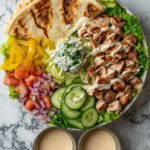 Leftover chicken and toppings store beautifully in airtight containers in the fridge for up to 3 days. Keep the tzatziki sauce separate to prevent the bowl from becoming soggy. When packed properly, your leftovers will retain their fresh flavors and vibrant textures.
