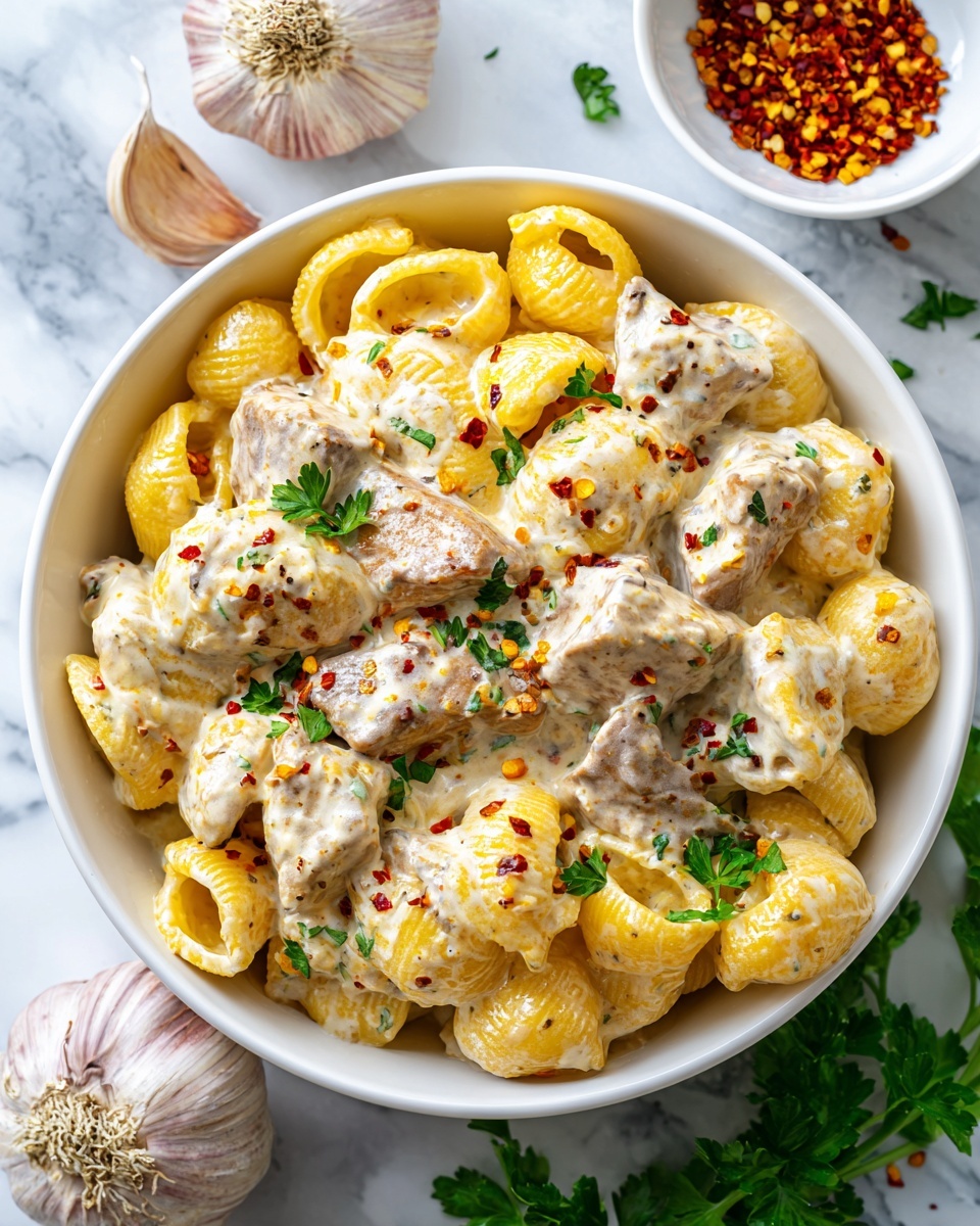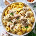 Gently fold in your cooked chicken pieces. Whether shredded or diced, make sure each bite will have delicious chicken coated in that rich, heavenly sauce. This step ensures the protein is evenly dispersed, making every spoonful a delight.