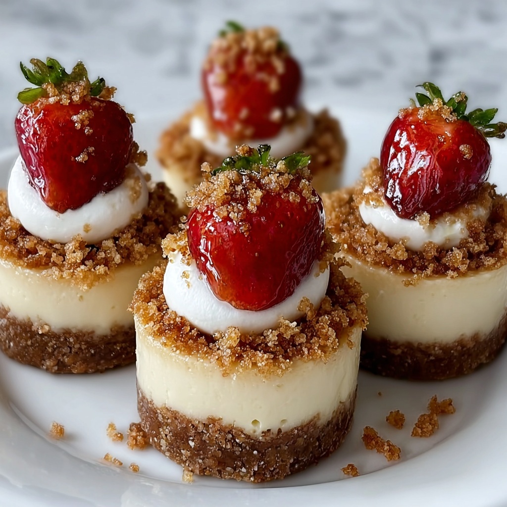 Elevate your Mini Strawberry Crunch Cheesecake Bites Recipe by adding fresh strawberry slices or a light dusting of powdered sugar on top. A small mint leaf also makes a pretty, fragrant touch that complements the fruity sweetness. These simple garnishes brighten the presentation and add an extra pop of freshness that your guests will adore.