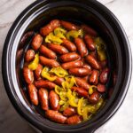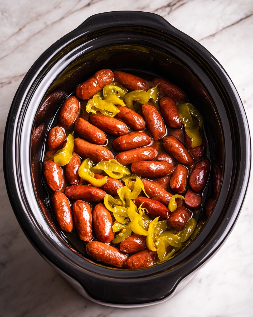 Start by gathering all your ingredients and tossing the Lil’ Smokies into your slow cooker or a medium saucepan. Add the butter, dry ranch seasoning, au jus gravy mix, sliced pepperoncini peppers, and the pepperoncini juice. Give everything a good stir until the sausages are fully coated in that mouthwatering blend of flavors.