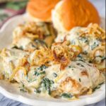 Monterey Chicken Pierogi Casserole is a comforting and hearty dish that combines creamy chicken soup, tangy sour cream, tender cooked chicken, spinach, and golden fried pierogis baked to perfection with a crunchy topping of French fried onions and melted Monterey Jack cheese. This easy-to-make casserole is perfect for a satisfying family dinner.