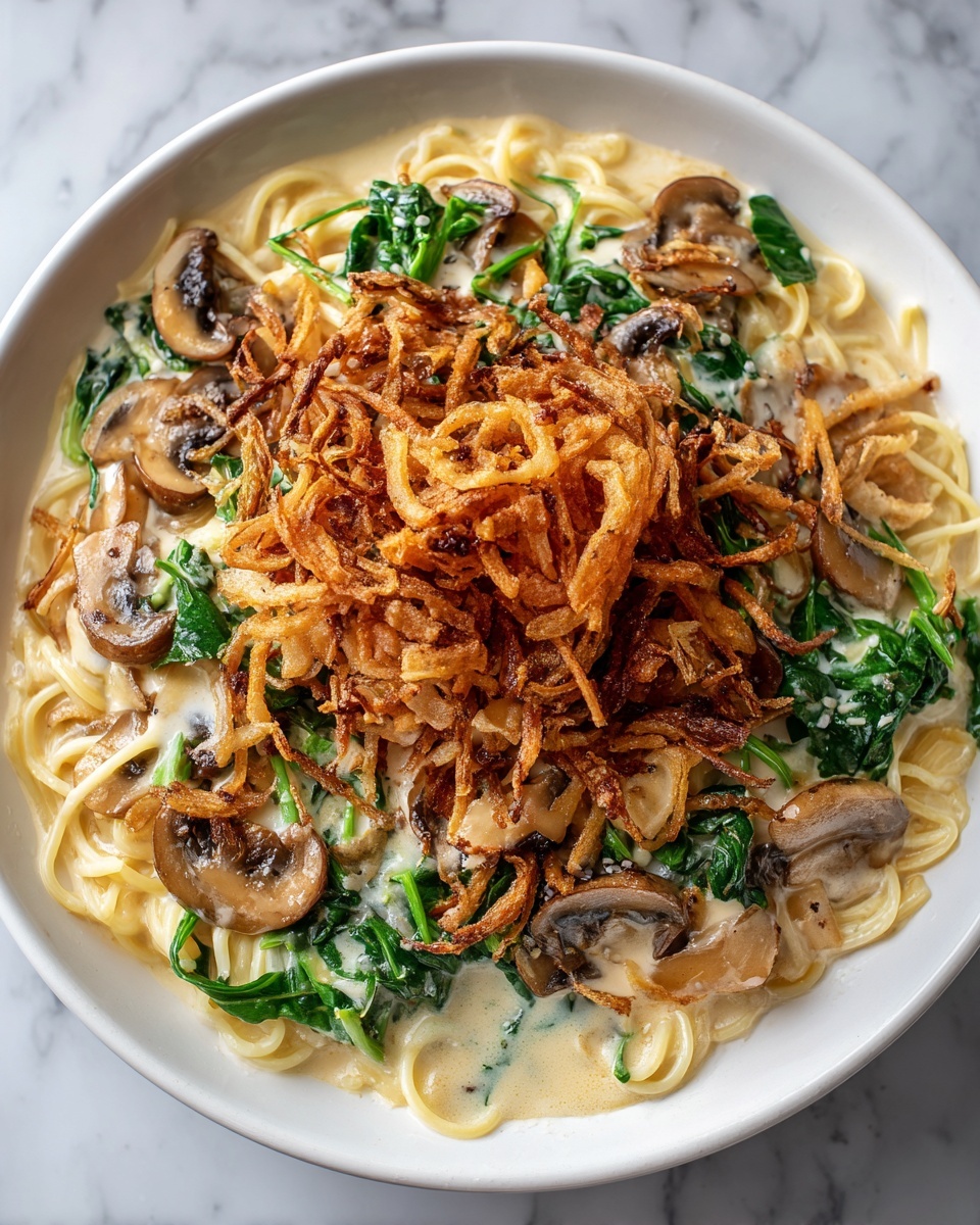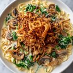 This Monterey Chicken Spaghetti Casserole is a comforting and creamy baked pasta dish featuring tender chicken, spinach, melted Monterey Jack cheese, and crispy French fried onions for a delightful crunchy topping. Perfect for a family dinner, this casserole combines simple ingredients into a hearty meal that’s full of flavor and easy to prepare.