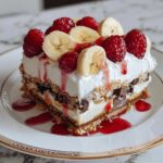 This No-Bake Banana Split Cake is a delightful layered dessert that combines a buttery graham cracker crust, creamy sweetened cream cheese topping, and fresh fruit layers inspired by the classic banana split. Easy to assemble and requiring no baking, this chilled cake features bananas, crushed pineapple, strawberries, maraschino cherries, and a whipped topping with optional nuts for added texture. Topped with chocolate syrup and extra cherries, it’s a perfect refreshing treat for summer or any occasion.