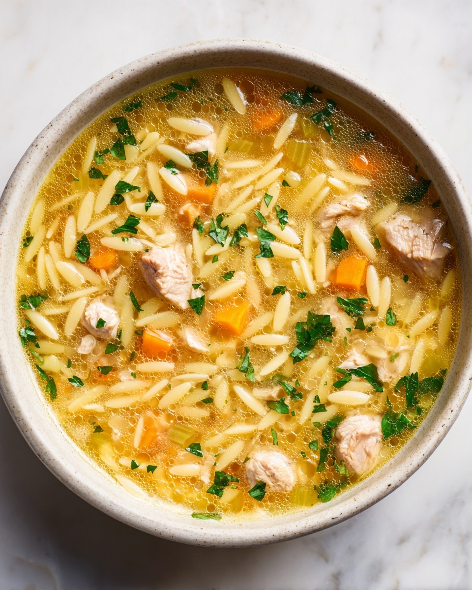 - Uncooked orzo pasta: Tiny, tender pearls that make the soup hearty yet light.
