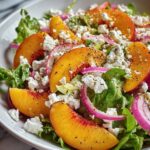 A refreshing and vibrant Peach Salad featuring ripe peaches, mixed greens, fresh mozzarella or feta, red onion, toasted nuts, and a touch of fresh basil, all drizzled with balsamic glaze or vinaigrette. Perfect as a light appetizer or a healthy summer meal.