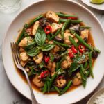 Remove the pan from heat and stir in the chopped green onions and herbs like basil or cilantro if you’re using them. These final touches bring brightness and an herbaceous note to your Quick Thai Chicken Stir Fry Recipe, rounding out the flavors and textures perfectly.