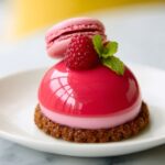 4. Make Raspberry Mousse: Soften the gelatin by blooming it in water. Warm the strained raspberry purée with sugar and lemon juice until just warm, then stir in the softened gelatin to dissolve. Allow the mixture to cool to room temperature. Once cooled, fold in the whipped heavy cream carefully to maintain the mousse’s airy consistency.
