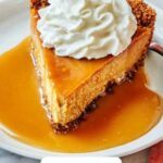 Try serving individual slices with mini pumpkin puree dollops on the side and caramel sauce adorning the plate like a painter’s brushstroke. You can also turn leftovers into cheesecake parfaits layered with crushed gingersnap cookies, whipped cream, and a drizzle of caramel for an easy yet impressive treat.