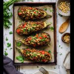 This Roasted Eggplant and Lamb recipe features tender roasted eggplant halves generously filled with a spiced ground lamb mixture, simmered with aromatic spices and tomatoes, then baked to perfection. Garnished with toasted pine nuts and fresh parsley, it’s a delicious and hearty Middle Eastern-inspired dish perfect for a comforting meal.