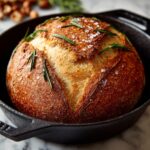 This Rustic No-Knead Rosemary Garlic Bread is an aromatic, crusty loaf perfect for beginners and seasoned bakers alike. Infused with fresh rosemary and garlic, this bread requires minimal effort and no kneading, relying on a long, slow rise to develop deep flavor and a beautiful, bubbly texture. Baked in a cast-iron skillet for a golden crust, this bread pairs wonderfully with soups, salads, or as a savory snack.