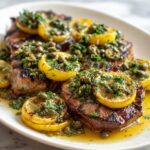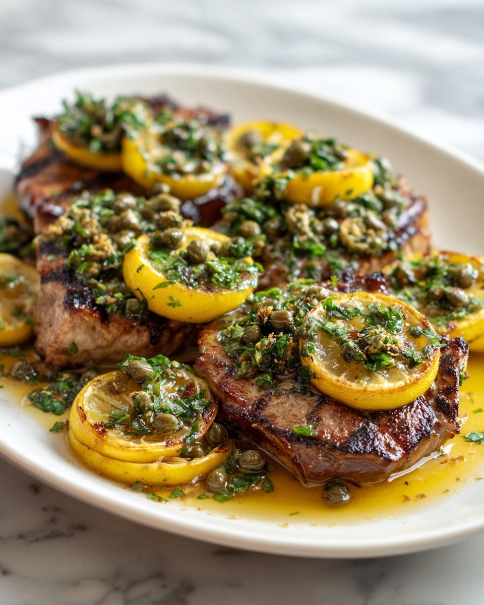 Seared Tuna Steaks with Lemon, Caper, and Parsley Butter is a quick and elegant seafood dish featuring perfectly seared tuna steaks topped with a flavorful compound butter made from fresh lemon juice, capers, and parsley. This Mediterranean-inspired recipe offers a healthy, protein-packed meal with vibrant citrus and herb accents, perfect for a wholesome dinner that’s ready in under 20 minutes.