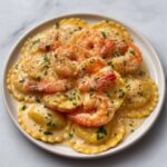 A delicious and creamy Italian-American seafood pasta featuring tender shrimp and lobster ravioli tossed in a rich garlic butter sauce, enhanced with Parmesan cheese and a hint of spice, perfect for an elegant yet easy-to-make main course.