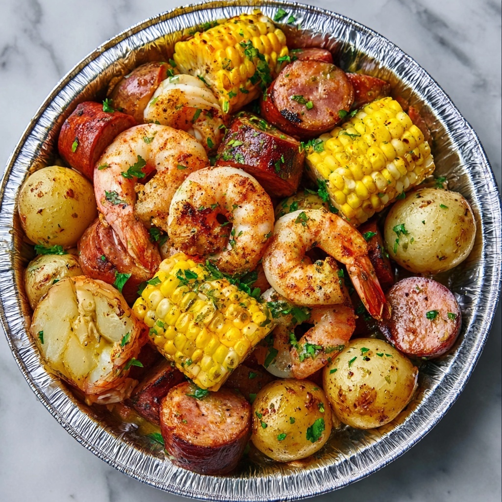 Divide the shrimp, corn, potatoes, and smoked sausage mixture evenly among four large sheets of heavy-duty foil. Fold each foil up and over the mixture, sealing tightly to lock in steam during cooking. These packets become self-contained little flavor bombs, making cooking and cleanup a breeze.