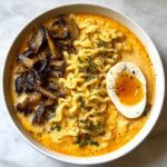 This Spicy Coconut Curry Ramen combines fragrant Thai red curry and creamy coconut milk with tender shiitake mushrooms and silky ramen noodles for a quick, flavorful, and comforting meal. Spiced with garlic, ginger, turmeric, and sambal oelek, this rich broth-infused ramen is topped with perfectly boiled eggs, toasted sesame oil, sesame seeds, and fresh chives for an authentic Asian-inspired dinner ready in just 20 minutes.