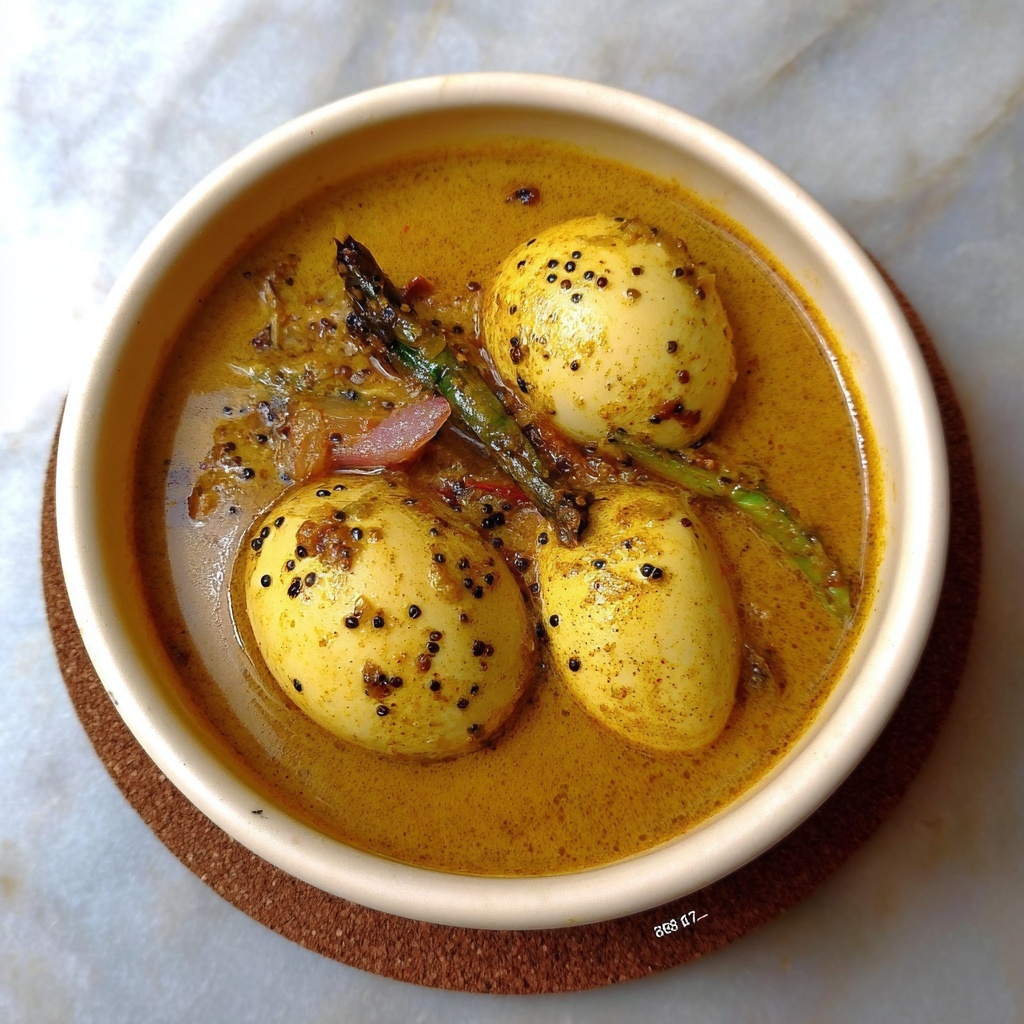 A flavorful and aromatic Sri Lankan Egg Curry featuring hard-boiled eggs simmered in a rich, spiced coconut milk gravy. This traditional dish combines a blend of warm spices and fresh ingredients, perfect to serve with rice or roti for a wholesome meal.