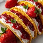Strawberry Cheesecake Tacos are a delightful dessert combining crispy cinnamon-sugar-coated taco shells with a rich and creamy cheesecake filling, topped with fresh macerated strawberries and whipped cream. Perfect for a quick and impressive treat, these tacos offer a unique twist on traditional cheesecake that’s sure to please your sweet tooth.