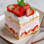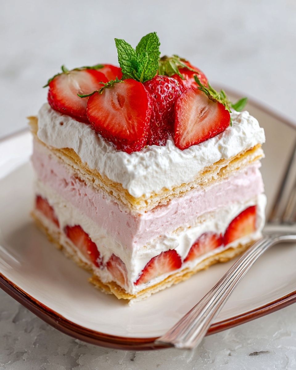 When it’s time to serve, presentation matters as much as flavor. Add a generous dollop of whipped cream on each slice to enhance the creamy elements and garnish with fresh strawberry halves or slices for a fresh, colorful touch. A sprinkle of chopped mint or a light dusting of powdered sugar can also make your serving look effortlessly elegant.