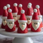 Fill a piping bag fitted with a small round or star tip with your whipped cream. Pipe a fluffy dollop at the base of each strawberry, then gently place the pre-cut top back on as Santa’s hat. Add a tiny whipped cream dot on the hat tip and two small dots on the front for adorable buttons.